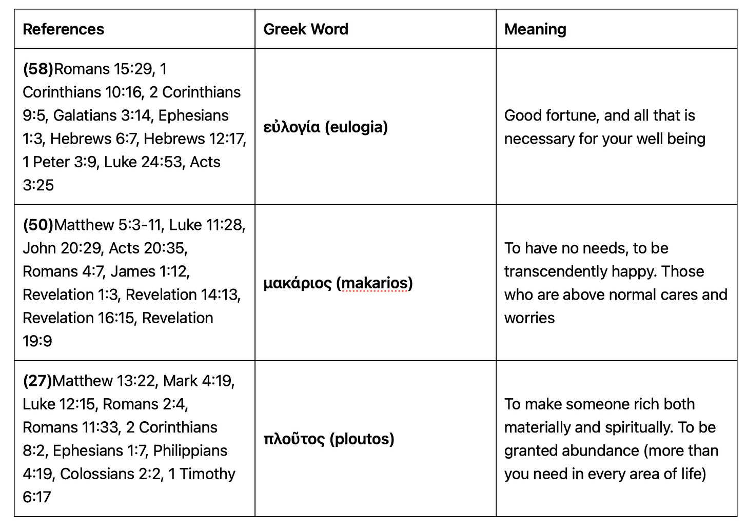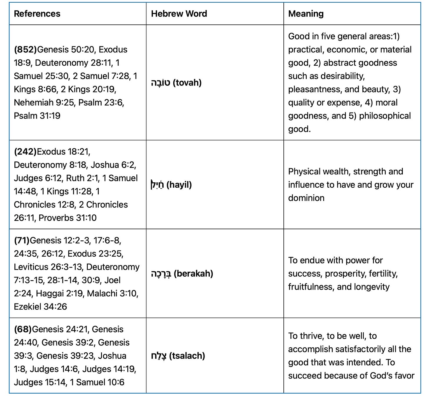 There are four main words for prosperity used in the Old Testament. You can see them listed in order of mention in this table. These aren’t all the words used in the Old Testament, just the top four. Prosperity is mentioned a lot. Overwhelmingly, the Old Testament mentions not just spiritual wealth and prosperity, but physical prosperity, including, but not limited to, financial prosperity.